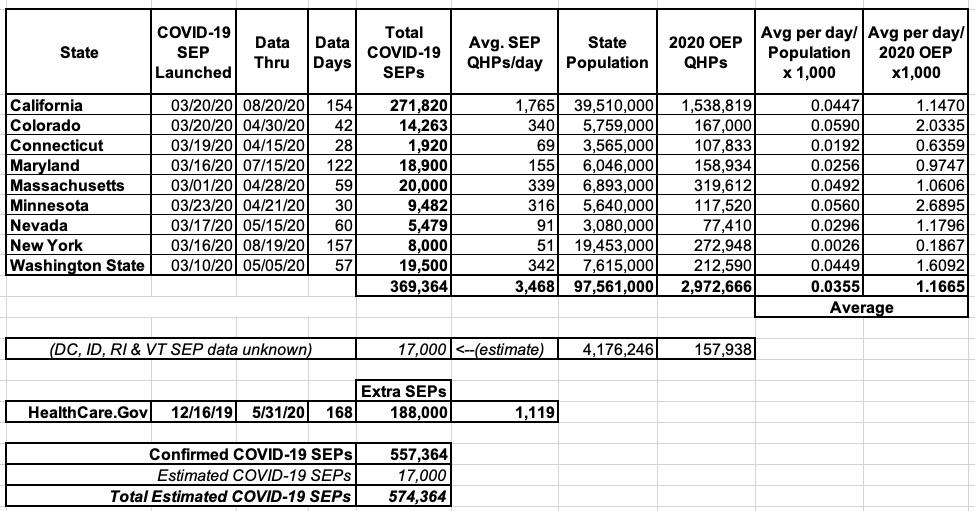 This brings the total number of confirmed COVID-19 SEP ACA exchange enrollees nationally up to around 557,000 nationally (369,000 confirmed across 9 states with their own ACA exchanges plus around 188,000 "extra" SEP enrollments via HealthCare.Gov). I also estimate that the remaining 4 state-based exchanges (DC, Idaho, Rhode Island and Vermont) have added perhaps 17,000 more SEP enrollments specifically due to the COVID-19 pandemic. Idaho never opened up a formal COVID SEP, but they have at least eliminated the verification requirement for standard SEP enrollees.