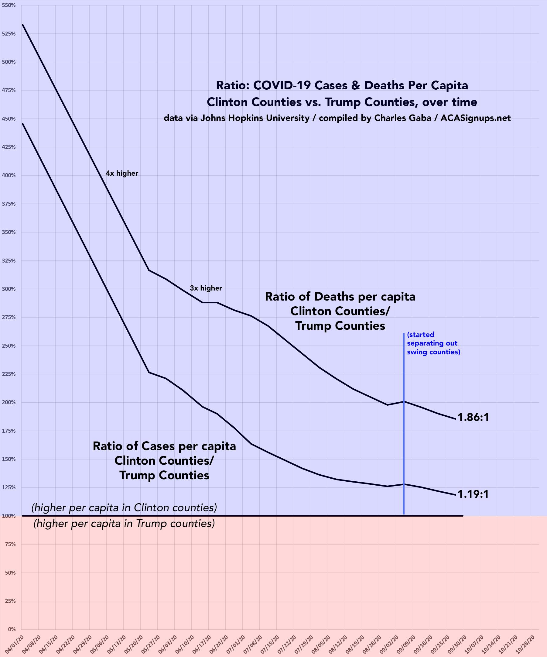 With these updates in mind, here's the top 100 counties ranked by per capita COVID-19 cases as of Saturday, September 26th (click image for high-res version). Blue = Hillary Clinton won by more than 6 points; Orange = Donald Trump won by more than 6 points; Yellow = Swing District