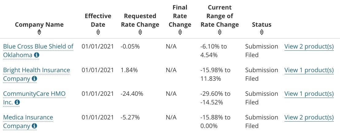 A month ago the Oklahoma Insurance Department posted the preliminary 2021 individual & small group market rate filings, including the following press release: