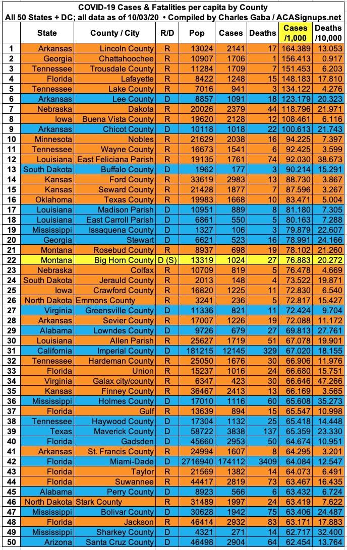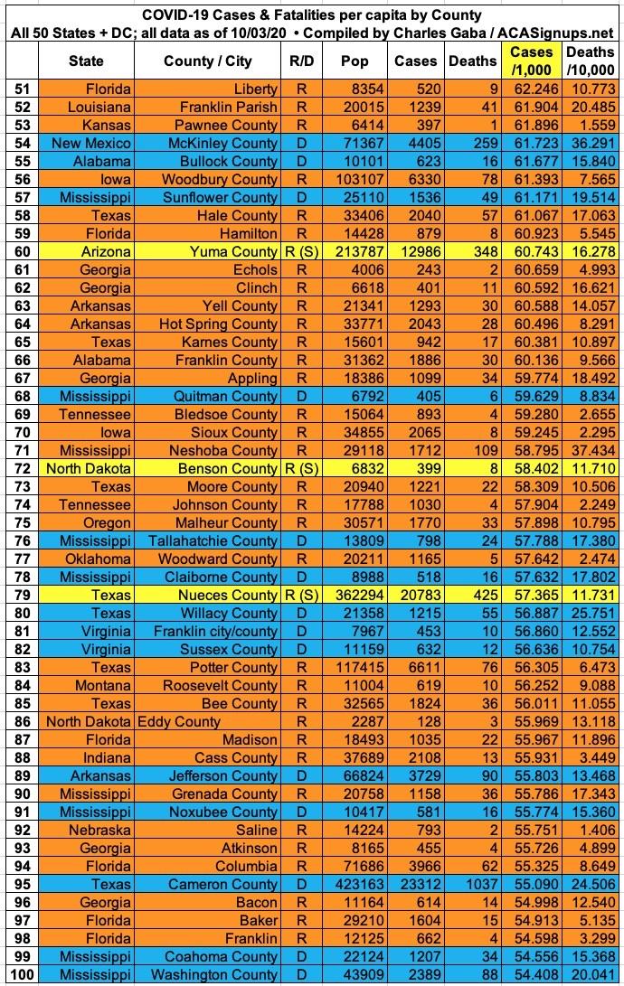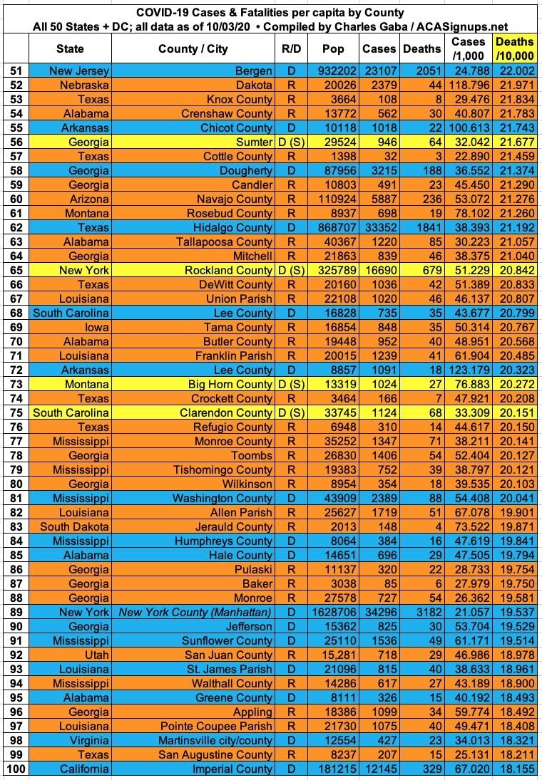 Here's the top 100 counties ranked by per capita COVID-19 fatalities as of Saturday, October 10th (click image for high-res version):