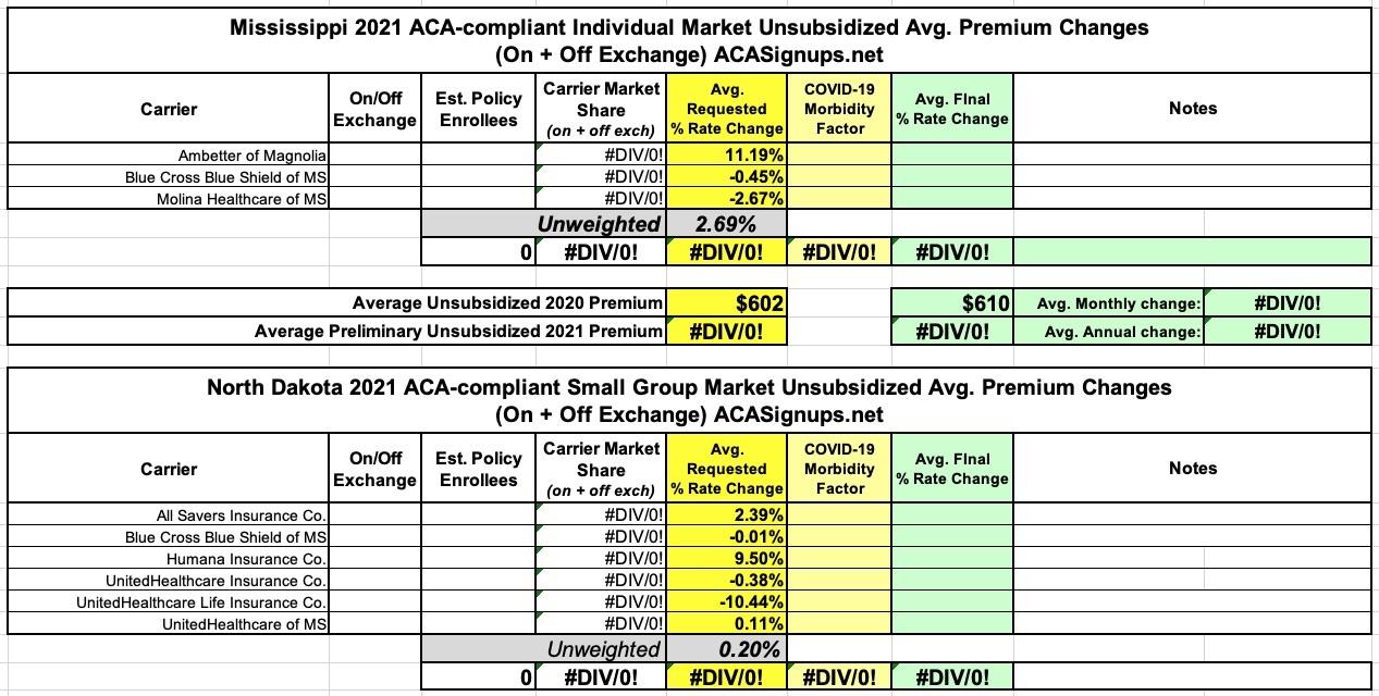 Mississippi once again has two carriers offering ACA-compliant individual market coverage in 2021 and six on the small group market. Unfortunately, few filing forms don't seem to be available and the ones which are are redacted, so I can't run weighted averages for either.