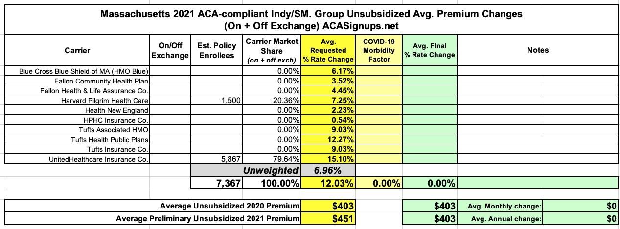 Massachusetts: Preliminary avg. 2021 #ACA premiums: 7% (unweighted; combined indy/sm. group market)