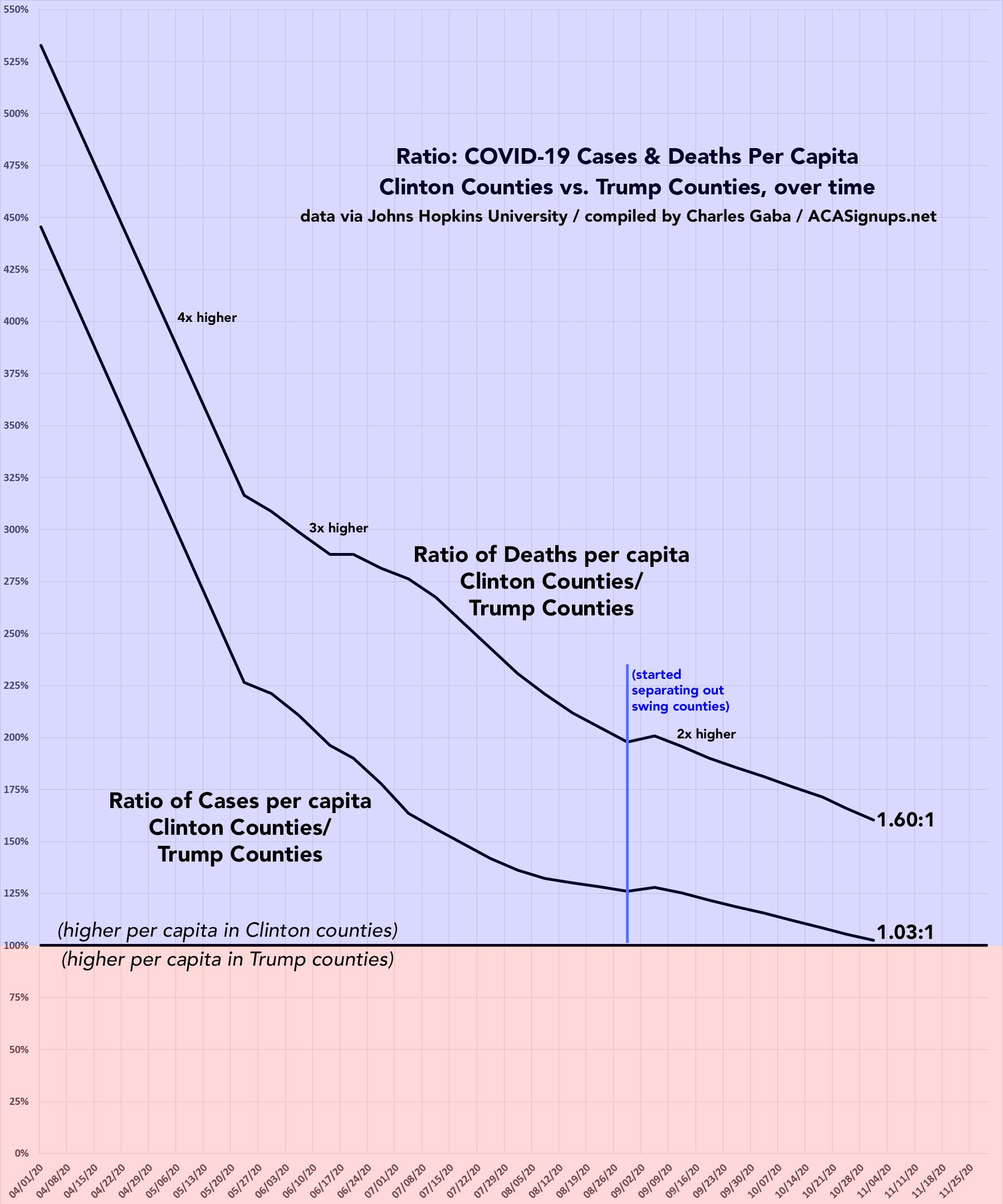As you can see below, separating out the ~200 swing counties from the Red and Blue ones caused the ratio between the two for both case rates and death rates to bump back up towards a higher blue county rate, but only slightly and only for that one week. The trend has continued downwards since then: