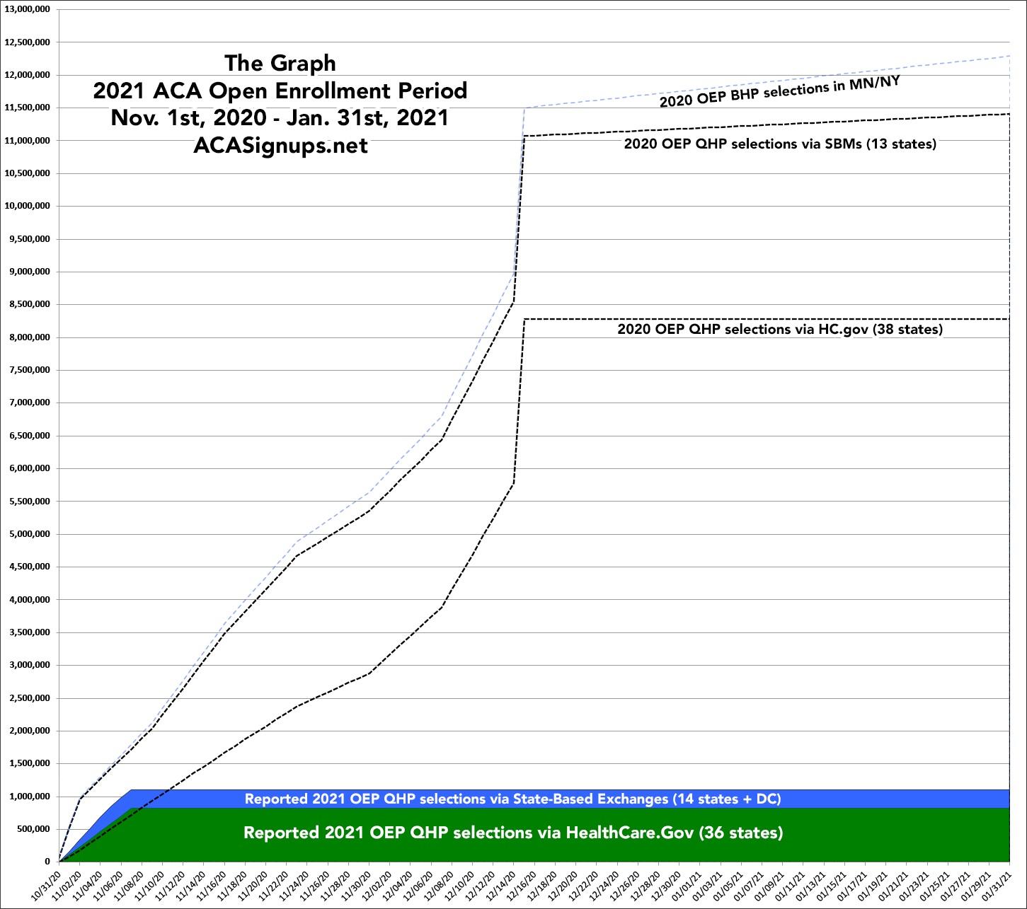 The reality is that The Graph itself doesn't serve a whole lot of useful function anymore. The enrollment patterns were erratic the first couple of years but have since settled into a pretty predictable...if not downright boring pattern for both the federal and state exchanges. The main reason I keep doing it each year is mostly out of tradition these days; after all, without The Graph, there wouldn't be an ACA Signups and I wouldn't have become a healthcare policy wonk in the first place.