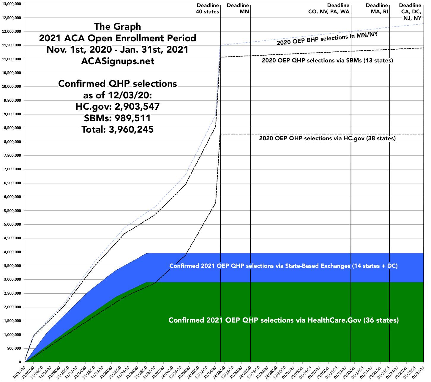 Still, The Graph remains a fun way of visualizing ACA Open Enrollment trends. Again, the dotted lines show last year's enrollment patterns for HealthCare.Gov, the 13 state-based exchanges (SBE) and BHP enrollments in Minnesota & New York. This year the lines will shift slightly due to Pennsylvania and New Jersey splitting off onto their own state-based exchanges, but the final totals will likely be similar...or perhaps not!