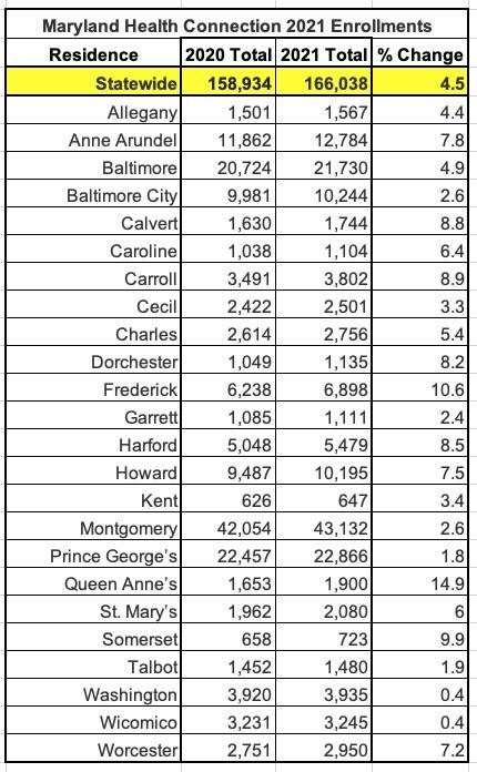 ANNAPOLIS, MD—Governor Larry Hogan today announced that more than 166,000 Marylanders enrolled in private health coverage for 2021 through Maryland Health Connection—the largest enrollment ever on the state’s health insurance marketplace—which represents a 4.5% increase of about 7,100 enrollees since the previous year.