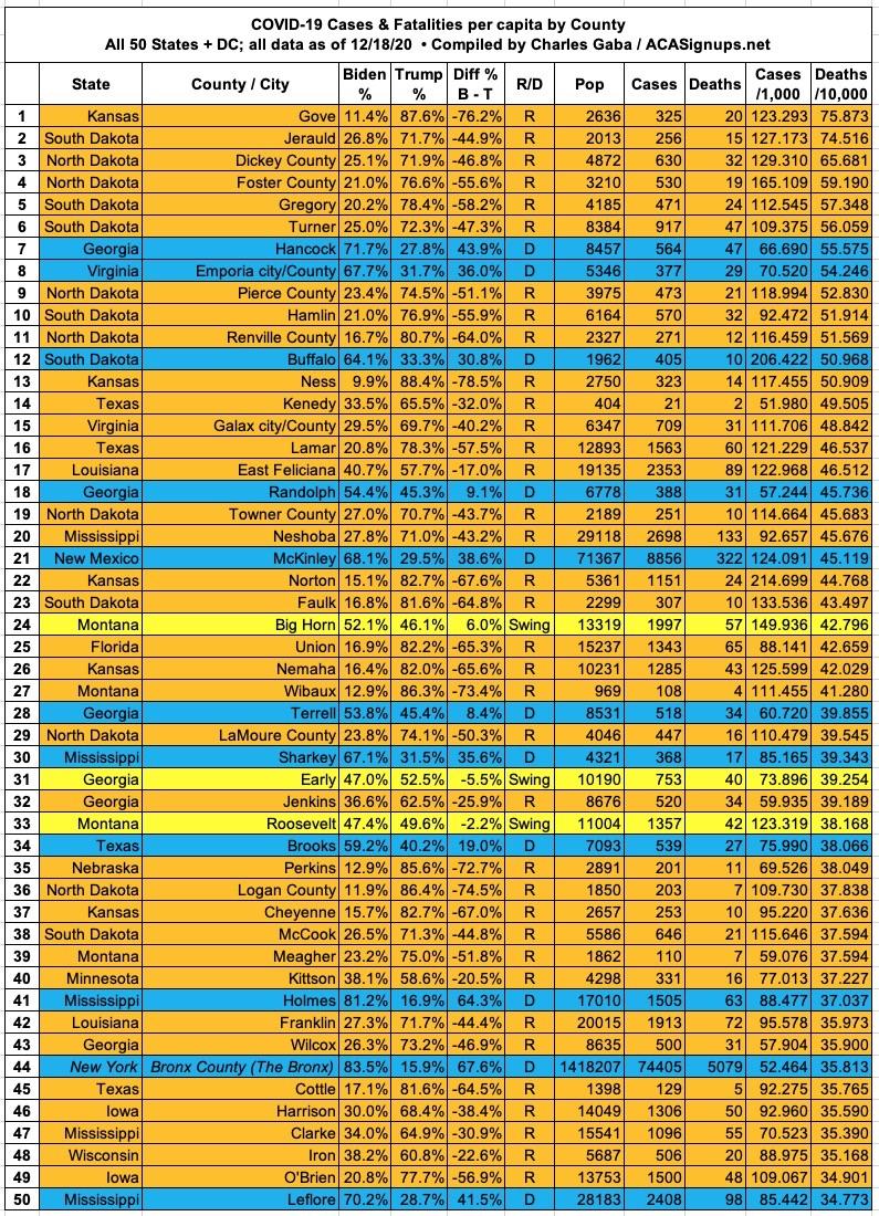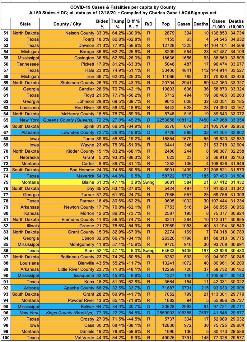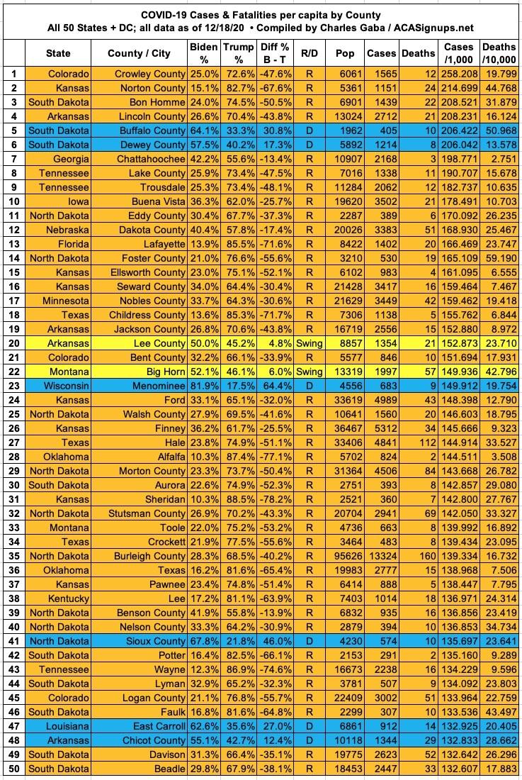 Here's the top 100 counties ranked by per capita COVID-19 fatalities as of Friday, December 18th (click image for high-res version):