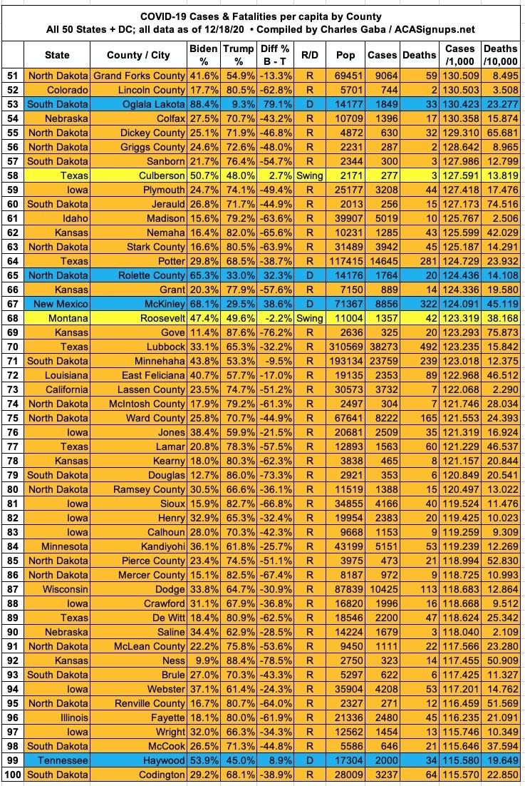 With these updates in mind, here's the top 100 counties ranked by per capita COVID-19 cases as of Friday, December 18th (click image for high-res version).