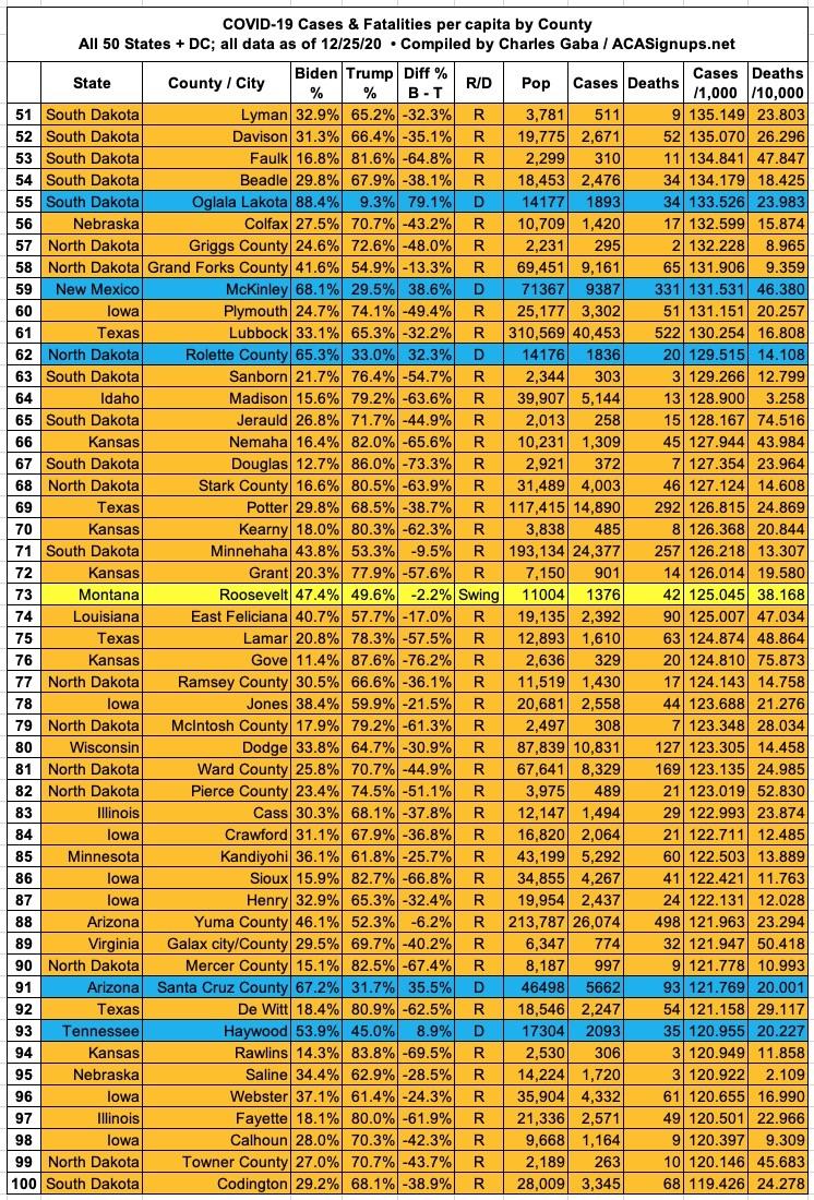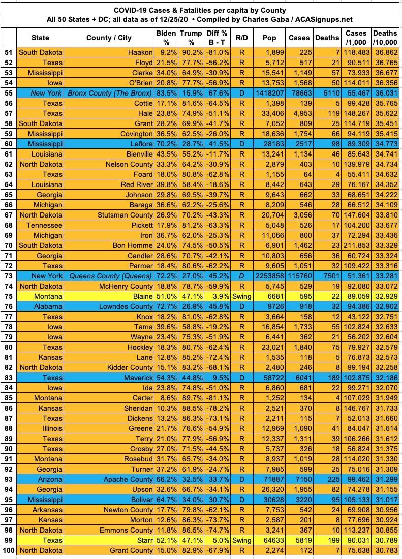 Here's the top 100 counties ranked by per capita COVID-19 fatalities as of Friday, December 25th (click image for high-res version):