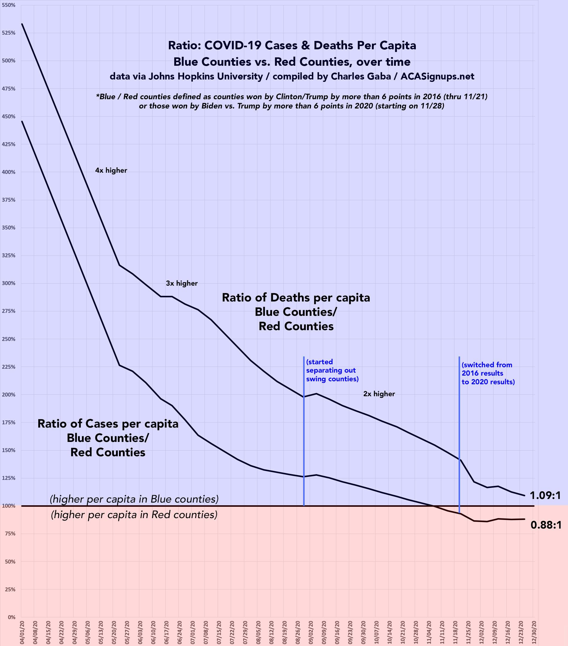 It's also worth noting how the ratio of per capita cases and mortality have shifted between the Blue and Red-leaning counties over time.