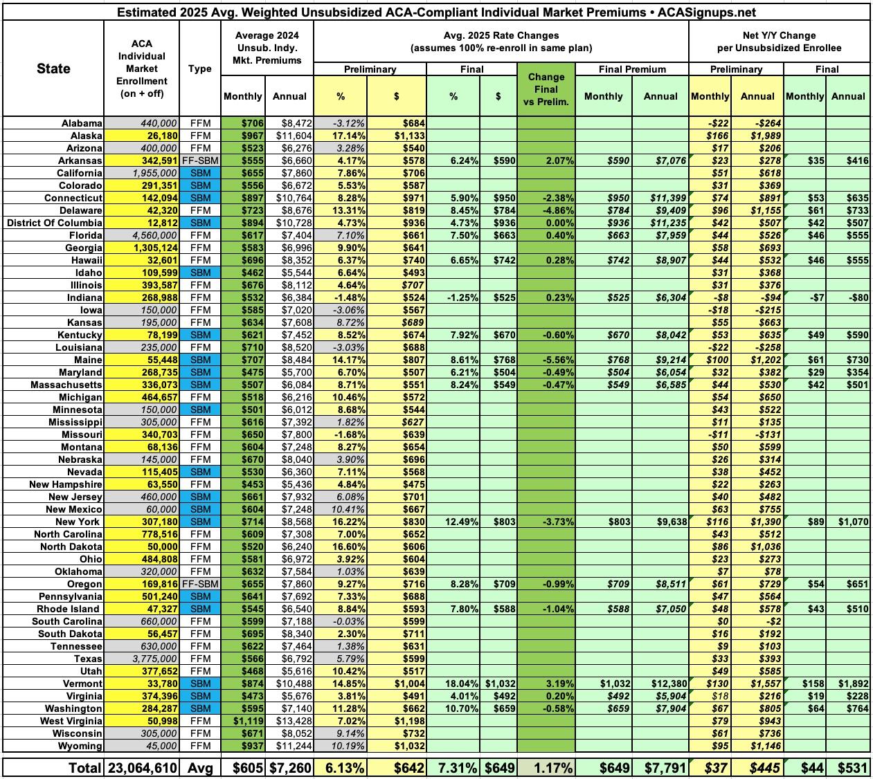 I've also been able to run the numbers for the final, approved rate changes in 17 states (all of which happen to be fully weighted). Across those 17 states only, the final average premium increase for unsubsidized individual market enrollees is 7.3%. This will shift higher or lower as each of the remaining states has their 2025 rate changes finalized.