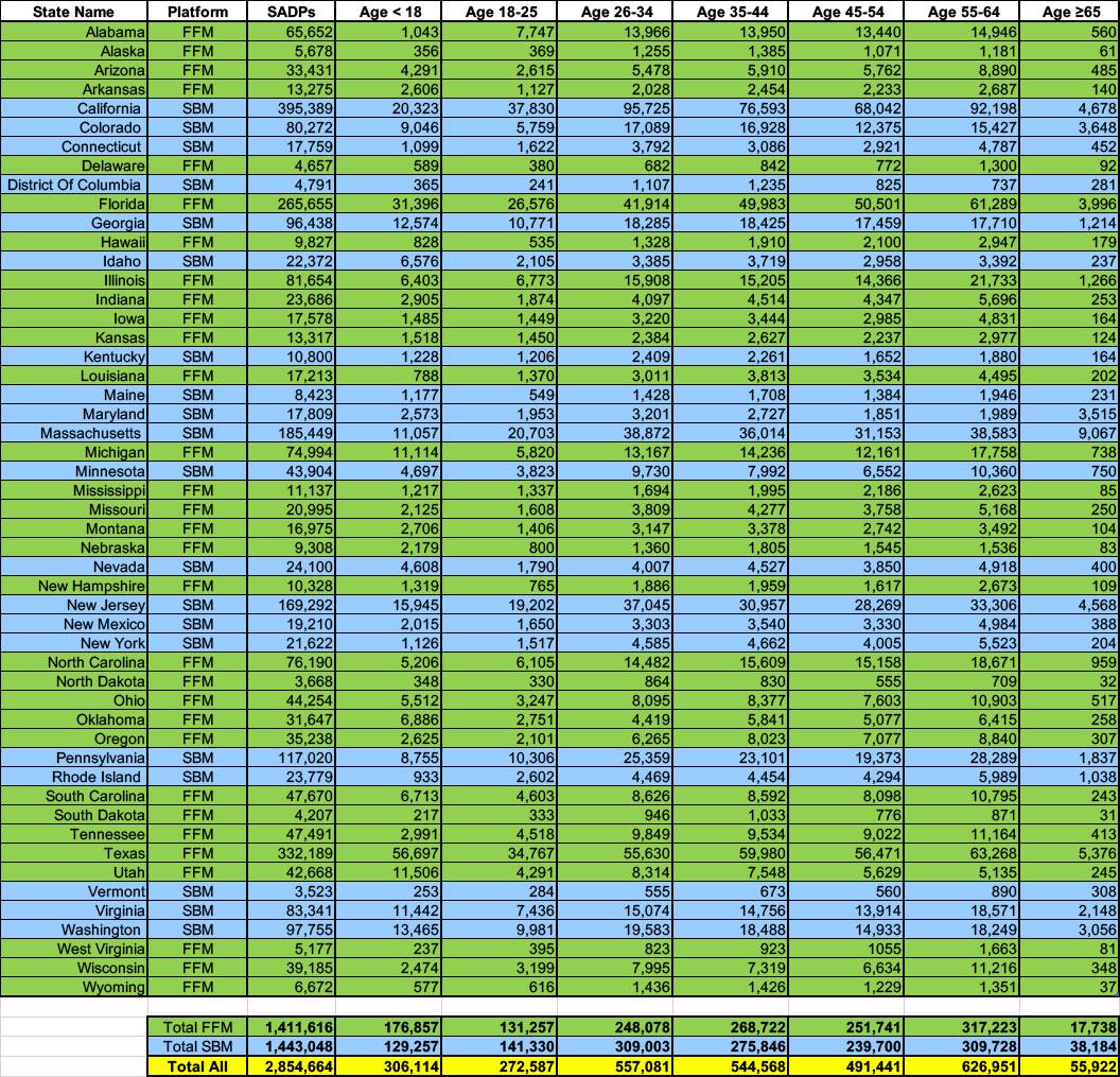 Alabama has the lowest percent of enrollees under 18 (3.6%), while Utah has the highest (27.8%) which I guess makes sense since Utah has the youngest median-aged population in the country. Similarly, Utah has the highest percent of enrollees under 35 (58.6%) vs. Hawaii's 26.2% (lowest).