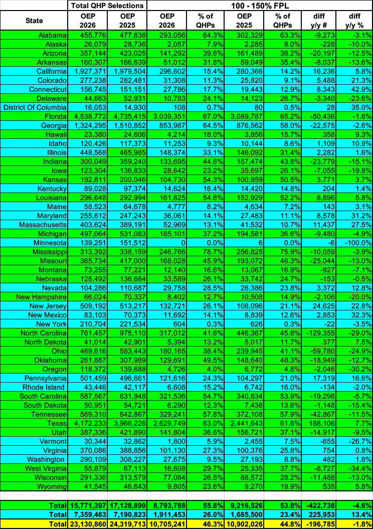 Combined, enrollment in the 100 - 200% FPL range dropped by over 415,000 people, or 2.7% nationally, although there are 16 states where it actually increased, and 5 states (all blue, all operating their own exchanges) where it increased by double digits: