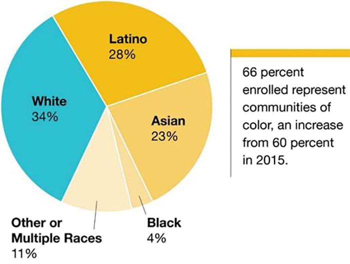 Over the past six years, Covered California has seen a steady increase in the diversity of its new consumers who sign up during special and open enrollment. The data shows that nearly two-thirds (66 percent) are from communities of color, which represents an increase from 60 percent in 2015 (see Figure 3. Special and Open-Enrollment Plan Selections by Ethnicity).