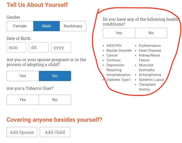 When you go to "compare Obamacare options" you get a contact form. Most of the questions ask standard stuff (and kudos to them for the "nonbinary" option! Very woke!)...but it also asks whether you have any of the following conditions: