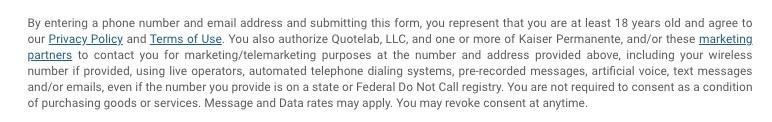 By entering a phone number and email address and submitting this form, you represent that you are at least 18 years old and agree to our Privacy Policy and Terms of Use. You also authorize Quotelab, LLC, and one or more of Kaiser Permanente, and/or these marketing partners to contact you for marketing/telemarketing purposes at the number and address provided above, including your wireless number if provided, using live operators, automated telephone dialing systems, pre-recorded messages, artificial voice, text messages and/or emails, even if the number you provide is on a state or Federal Do Not Call registry. You are not required to consent as a condition of purchasing goods or services. Message and Data rates may apply. You may revoke consent at anytime.