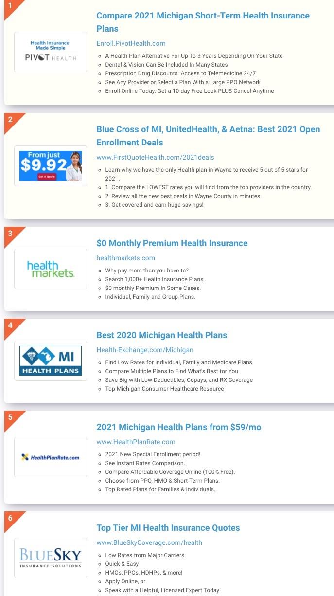It's far more likely that the most prominent sites to come up in Google's paid search listings will be third-party health insurance brokers. If you click on the link, you may be taken to a legitimate health insurance broker authorized to sell on-exchange ACA policies...or you may be taken to a fly-by-night quasi-legal outfit which either pushes junk plans or simply resells your contact info to fourth-party scammers. In many cases, they may even include the terms "Obamacare" or "ACA" baked into their names: