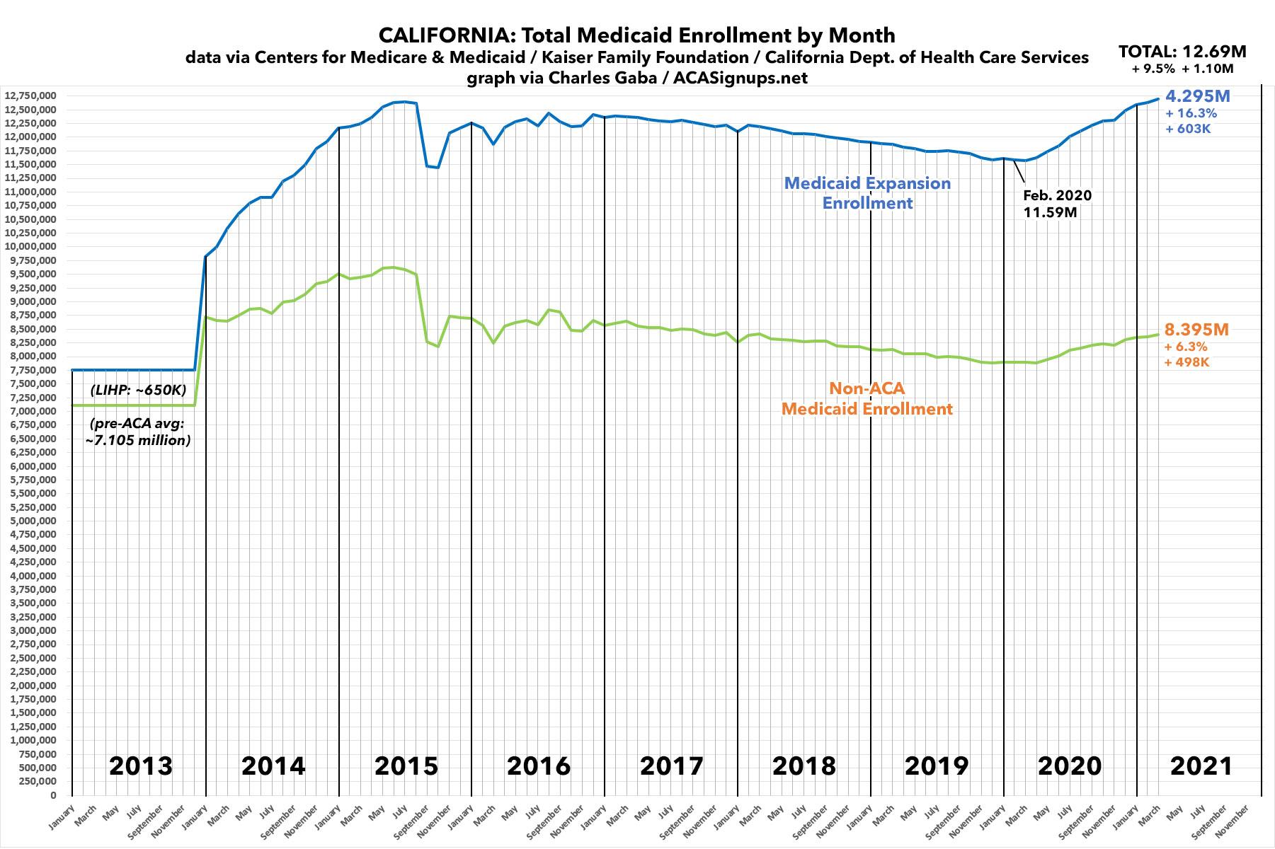 Enrollment gradually tapered off from around 12.5 million down to a low of 11.6 million in February 2020...and then COVID hit, of course. Since then, enrollment has risen back up again and as of March 2021, CA Medicaid enrollment stands at what I'm sure is an all-time high of 12.69 million people.