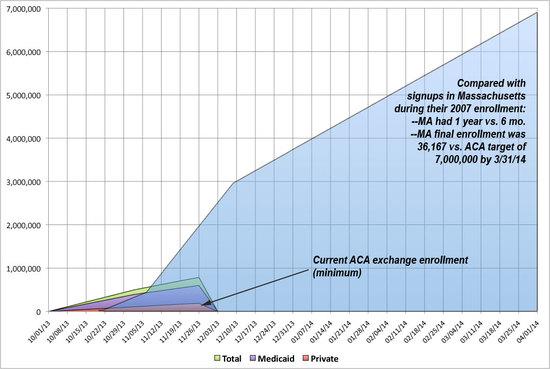 Update: Just to keep things in perspective (and reality-based), I've pulled out to the 7 million target figure and superimposed the Massachusetts "RomneyCare" signup chart from 2007 over it to give an idea of how that comparison is going. Bear in mind that they had a full year to signup vs. 6 months, so I've squished the timeframe in half to match the ACA target of 7 million by 3/31/14: