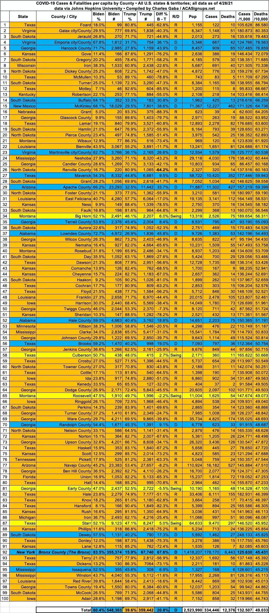 Here's the top 100 counties ranked by per capita COVID-19 fatalities as of Wednesday, April 28th, 2021 (click image for high-res version):