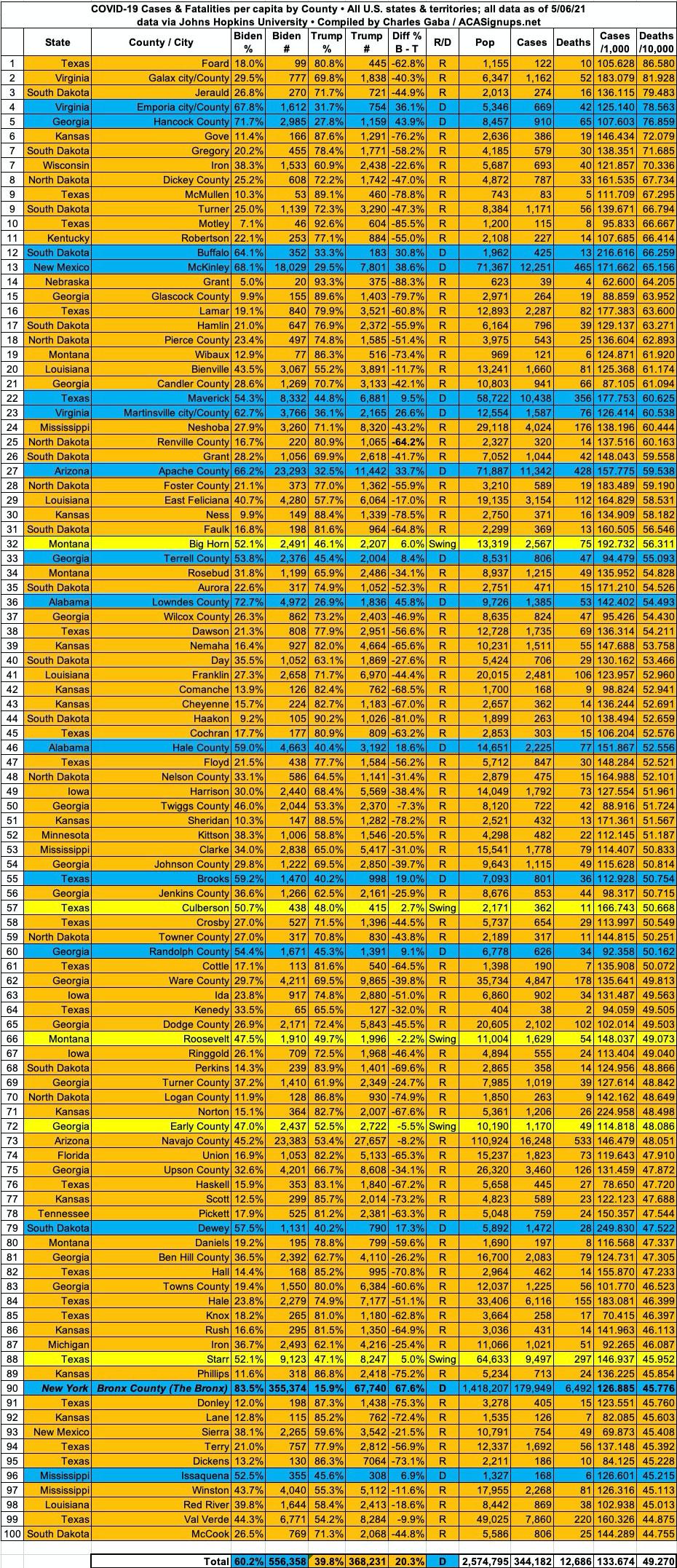 Here's the top 100 counties ranked by per capita COVID-19 fatalities as of Thursday, May 6th, 2021 (click image for high-res version):