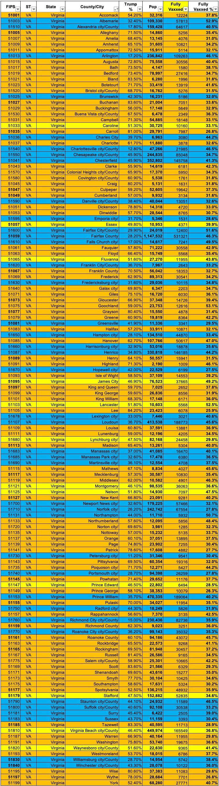 NOTE: The CDC lists ~1.895 million Virginia residents (9.6% of the total fully vaccinated) whose county of residence is unknown. In addition, there are 9 counties which don't list any vaccination data at all. Both of these could skew the trendline significantly.