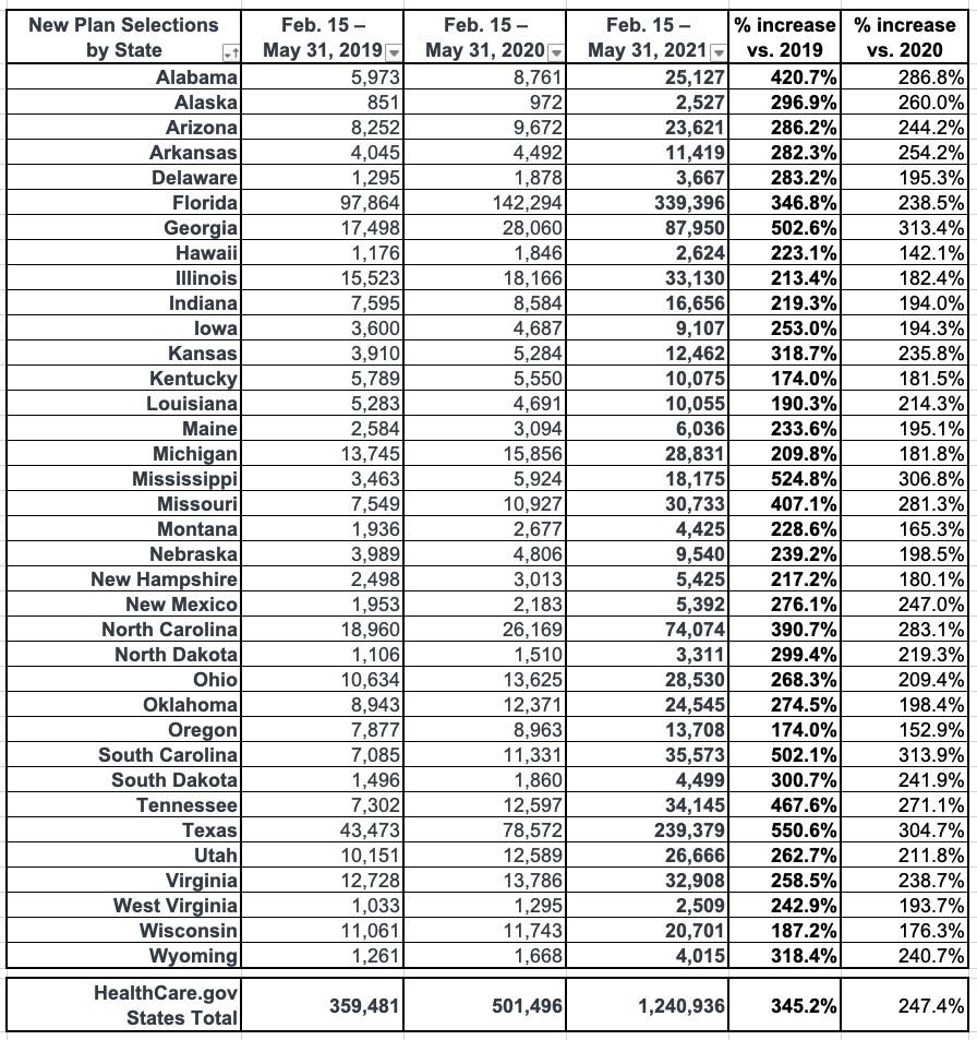The number of new plan selections from the start of the SEP opportunity on February 15 through May 31 represents a substantial increase in enrollment from the same period in 2020 and 2019, when 501,000 and 359,000 consumers signed up for Marketplace coverage, respectively.[2] In previous years, SEPs were available primarily only for qualifying life events, whereas this year the Biden-Harris Administration opened a SEP to all Americans in response to the COVID-19 Public Health Emergency.