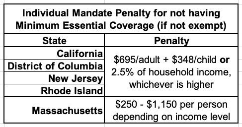 In CA, DC, NJ & RI, the penalty is pretty much identical to the old federal penalty: Either $695.00 per adult or $347.50 per child in the household or 2.5% of the total household income, whichever is greater.