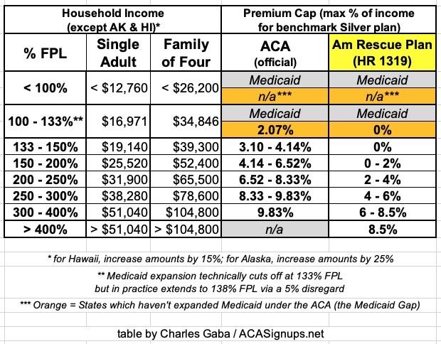Here's a table laying out the percent of your household income which you're restricted to paying for the benchmark Silver plan in your area under the original ACA formula and the new American Rescue Plan formula:
