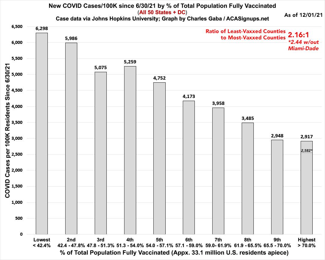 As you can see, case rates since June are 2.16x higher in the least-vaccinated tenth of the country than in the most-vaccinated tenth...slightly lower than a few weeks ago.