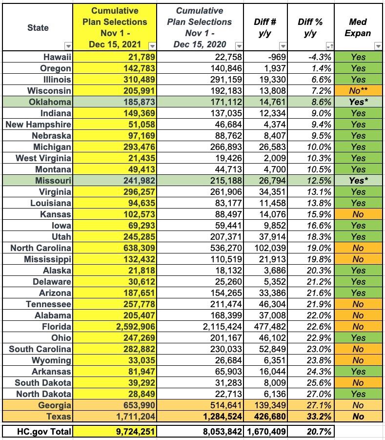 In other words, this report runs from Nov. 1st - the Dec. 15th preliminary deadline, which means I no longer have to account for the "missing" day that I have until now when comparing the data to last year. I do still have to subtract Kentucky, Maine & New Mexico from last year's federal exchange data, however, since all three are now state-based exchanges and are counted separately instead.