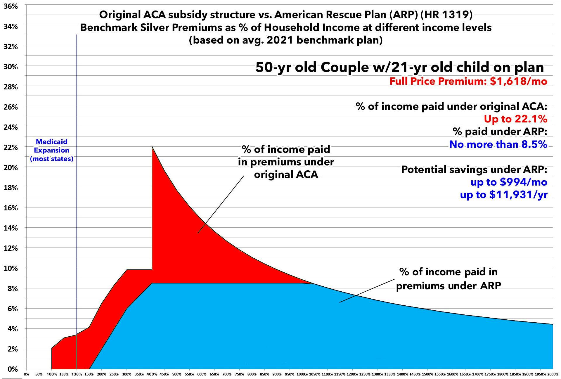 First of all, here's the final, official subsidy table under the ACA today vs. under the American Rescue Plan (ARP). This is the table which will be used at least for 2021 & 2022 (and yes, it's supposed to be retroactive to January 1st, 2021 for current ACA exchange enrollees):