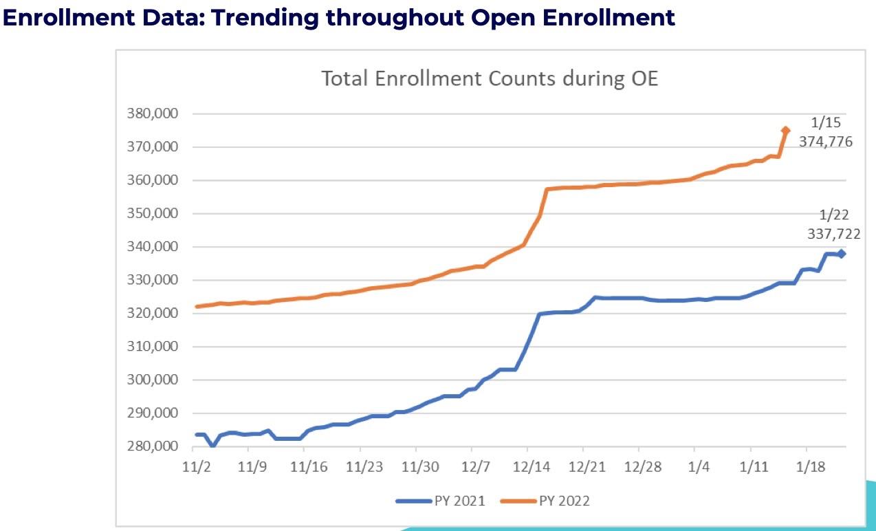 The main number: As of 1/15/21, 374,776 PA residents had selected or re-enrolled in Qualified Health Plans (QHPs) for 2022. This is up 11.0% vs. last year's final OEP total: