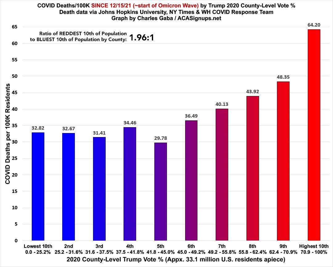 As you can see, aside from a brief period from early April through mid-June last year, the daily COVID death rate in the reddest 10% of the United States has been running several times higher than in the bluest 10% every day for over a year now. The discrepancy reached its peak at the height of the Delta Wave in late September, when it was briefly running nearly nine times higher in the reddest bracket than the bluest.