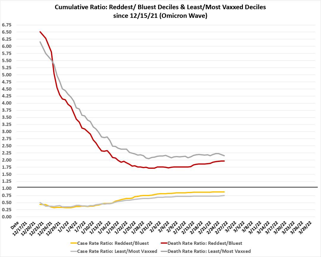 Cumulatively, since May 1st, 2021, the death rate has run 3.1x higher in the Reddest decile than the Bluest decile.