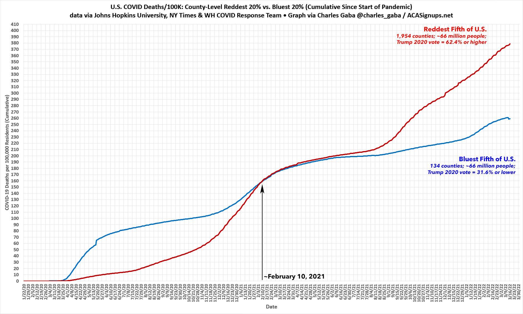 Meanwhile, Red America had things pretty easy until roughly mid-July 2020. From that point on, the death rate in MAGA Country began to catch up to Blue America, eventually crossing the blue line. It's never looked back since: (click image for high-res version)