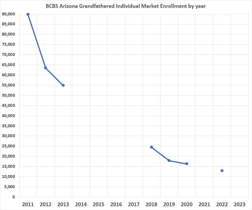 Arizona's 2023 ACA filings aren't available yet, but I was able to find a rate filing for Blue Cross Blue Shield's "Grandfathered" policies, so I decided to take a look at how enrollment in this pool has shrunk over time.