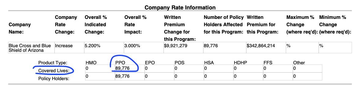 The earliest filing I was able to find is from 2011. At that time, BCBSAZ had nearly 90,000 Arizonans enrolled in their grandfathered policies (they also bumped up premiums by 3% that year). The total number of covered lives was identical to the number of policies, which seems odd, since that would mean every one of them was enrolled separately, but whatever: