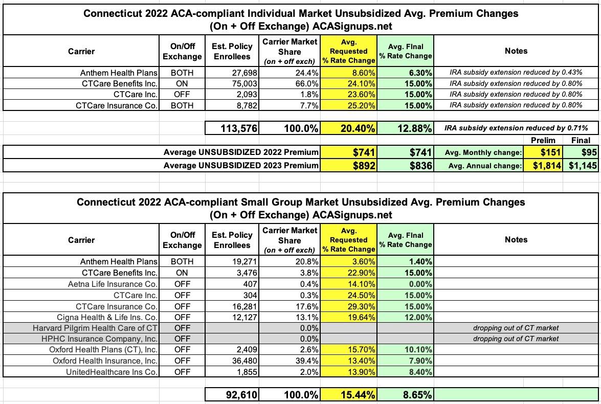 Connecticut: Final avg. unsubsidized 2023 #ACA rate changes: +12.9% (7.5 points lower than requested)