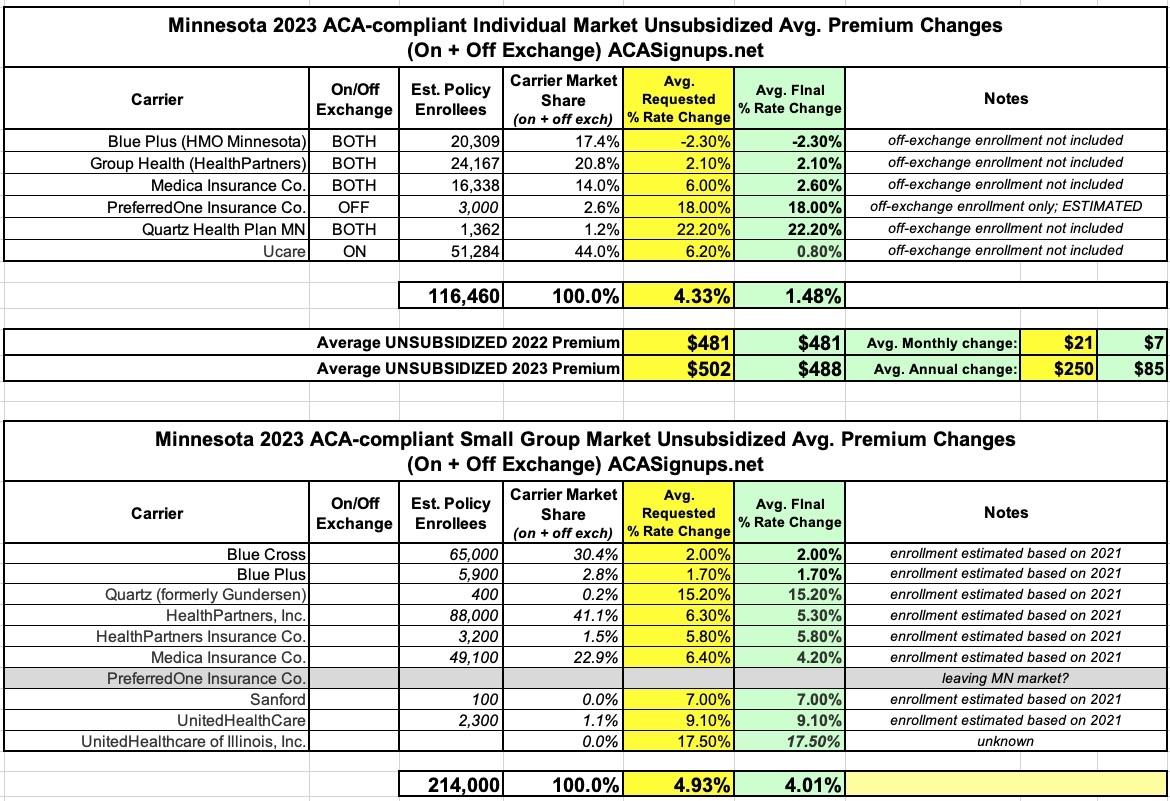 Minnesota: Final avg. unsubsidized 2023 #ACA rate changes: +1.5%