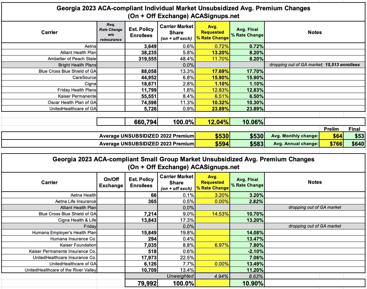 Georgia: Final avg. unsubsidized 2023 #ACA rate changes: +10.1% (down from +12.0%)