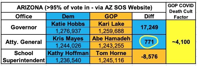 UPDATE 9pm Sunday: Well, most of the races above have been called now; Mark Kelly & Adrian Fontes have won AZ-Senate & AZ-SOS handily, while in Nevada, Gov. Sisolak lost, Francisco Aguilar won by more than the "death cult" margin and it looks like Catherine Cortez Masto did as well, although hers is by far the closest of these (it looks like she ended up winning by perhaps 5,000 votes or so).