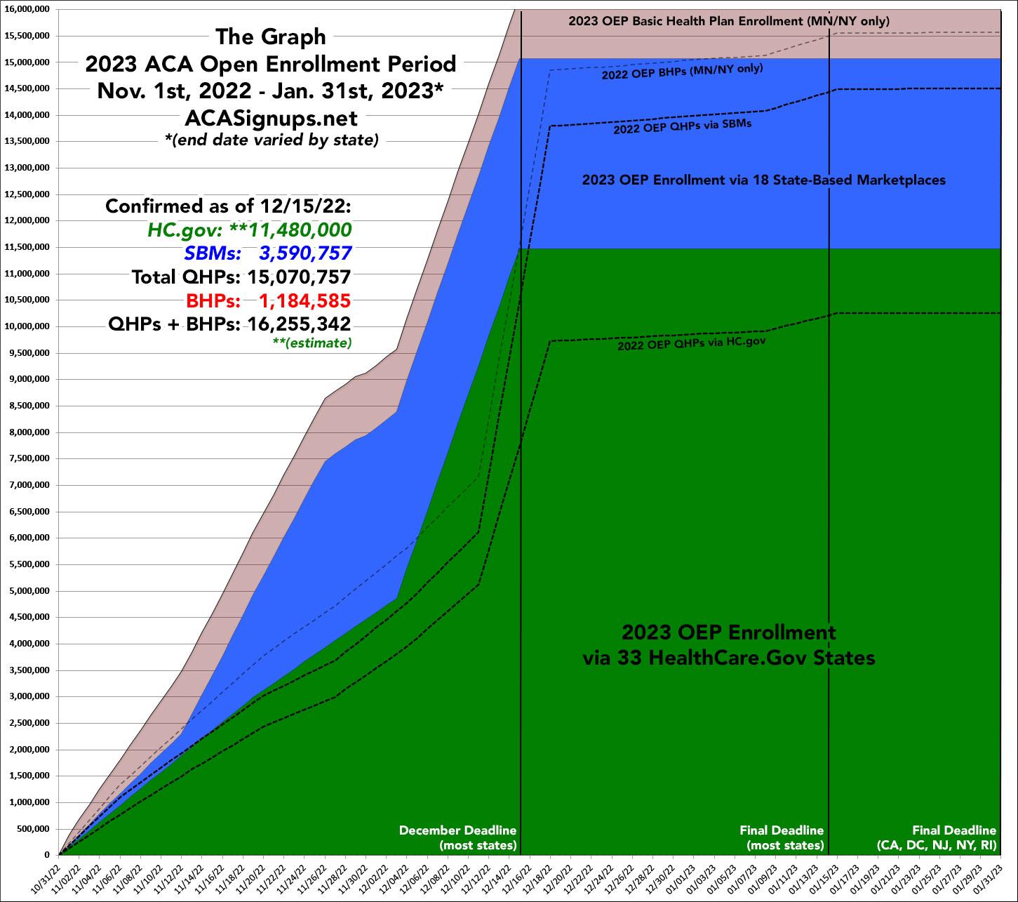 My guess is that it'll actually end up being somewhere between 17.5 - 18.0 million, however (again, including BHP enrollees); the state-based exchanges have been lagging behind the federal exchange so far this year (a reversal of the trend in prior years). That's difficult to be certain of, however, due to the different dates used in reporting both new enrollments, active-renewals and auto-renewals across the various exchanges.