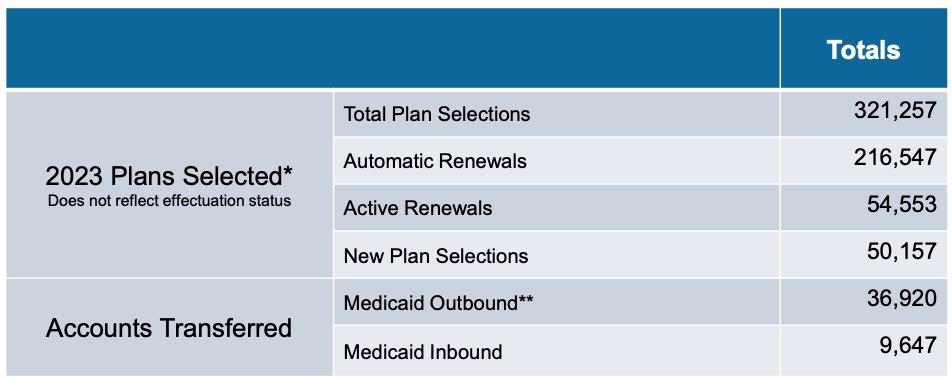 As of January 2nd, 321,257 residents signed up for 2023 health coverage, including 104,710 new or existing consumers who actively selected a plan and 216,547 who were automatically renewed.