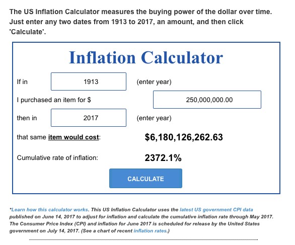 According to this Inflation Calculator tool, $250 million in 1913 dollars would be equivilant to around $6.2 billion today using U.S. Gov't. CPI data.