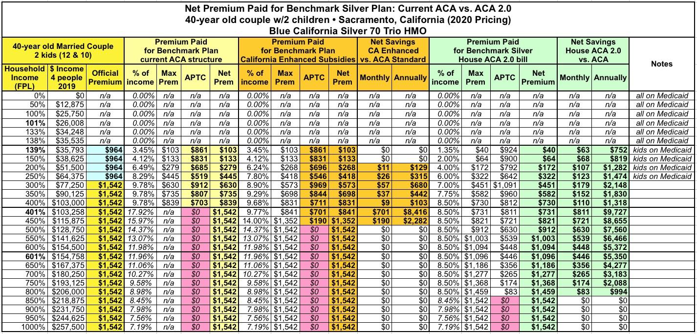 With that in mind, I've whipped up several examples showing how different California households will fare compared to the official ACA subsidy structure for 2020. It's important to keep in mind that all of these assume they're enrolling in the benchmark Silver plan. If they go for a Bronze, Gold, Platinum or different Silver, things will look a bit different as well.
