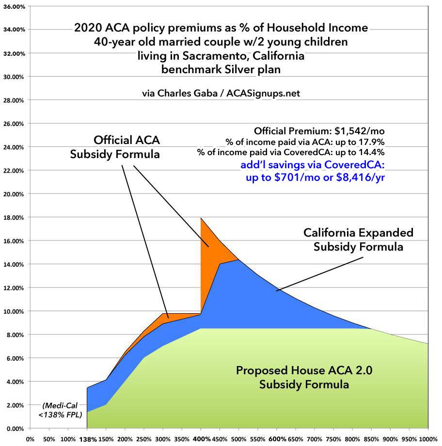 IMPORTANT: As I've noted before, Covered California has arranged to expand and enhance their ACA premium subsidies beyond the official ACA formula starting with the 2020 Open Enrollment Period. Back in October, I posted a detailed analysis, complete with tables and graphs to explain just how much hundreds of thousands of Californians could save under the new, beefed-up subsidy structure.