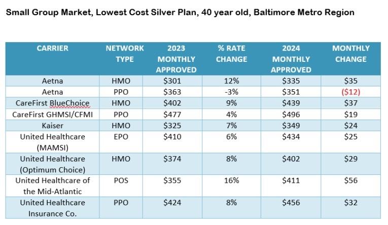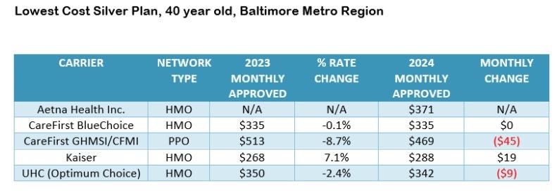 As an example, for a 40-year-old living in the Baltimore metro region, rate changes for the lowest cost off-exchange silver plans range from -3% to 16%, with average monthly differences ranging from -$12 per month to $56 per month.