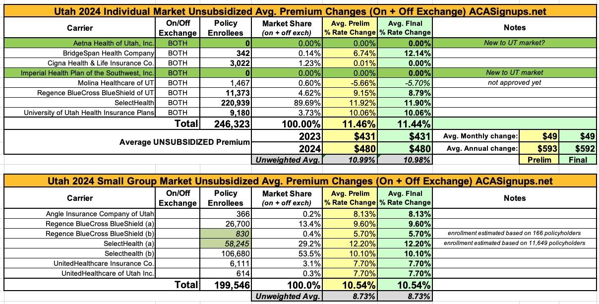 Utah: *Final* avg. unsubsidized 2024 #ACA rate changes: +11.4%; Aetna & Imperial joining indy market