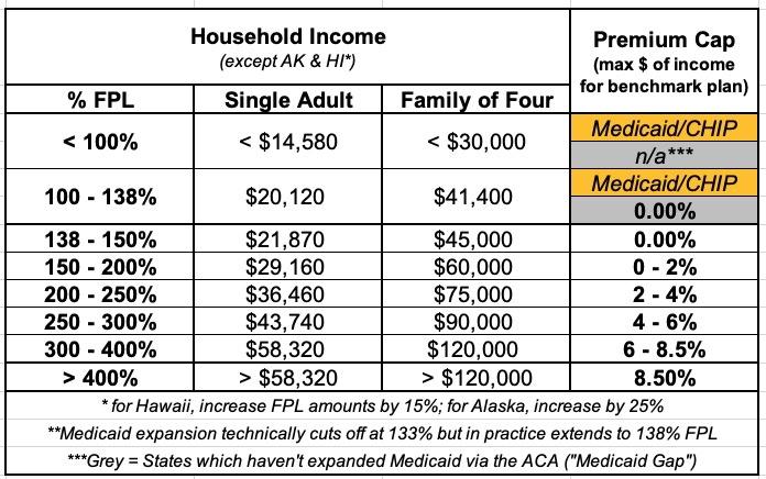 Before I get into this, it's important to understand what the Federal Poverty Line (or FPL) is. 100% FPL depends on how many people live in your household. For a single adult with no dependents, it's $14,580/year; for a family of four, it's $30,000/year. These amounts increase a bit each year to account for inflation.